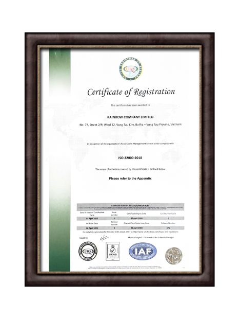 The ISO 22000:2018 certification affirms that Rainbow Company Limited’s food safety management system meets international standards.