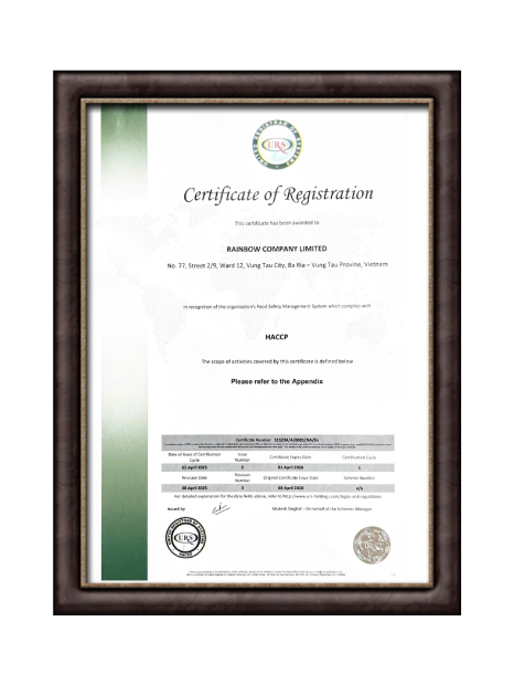 The HACCP certification affirms Rainbow Company Limited’s capability to manage food safety in accordance with international standards.