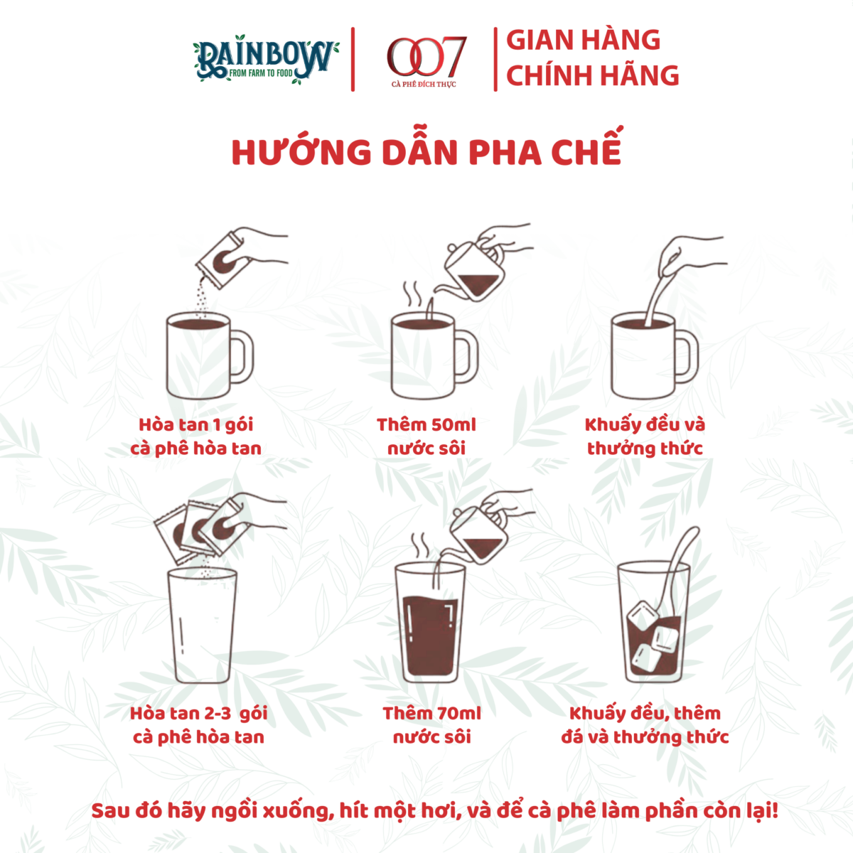 Uống lạnh: 2 gói + 70ml nước sôi + đá