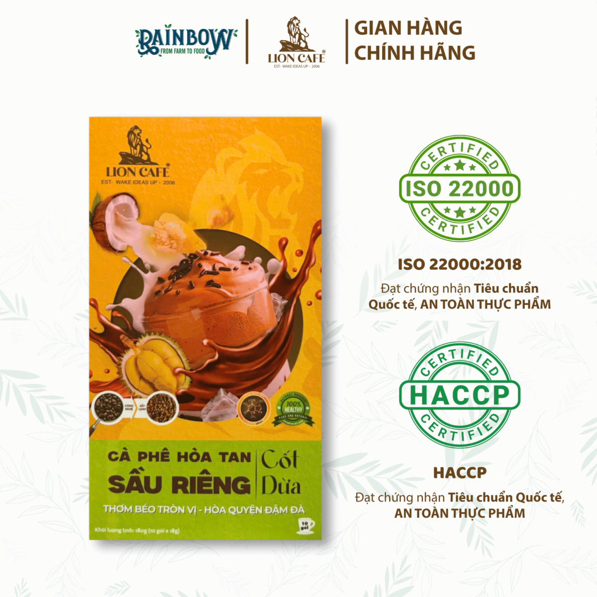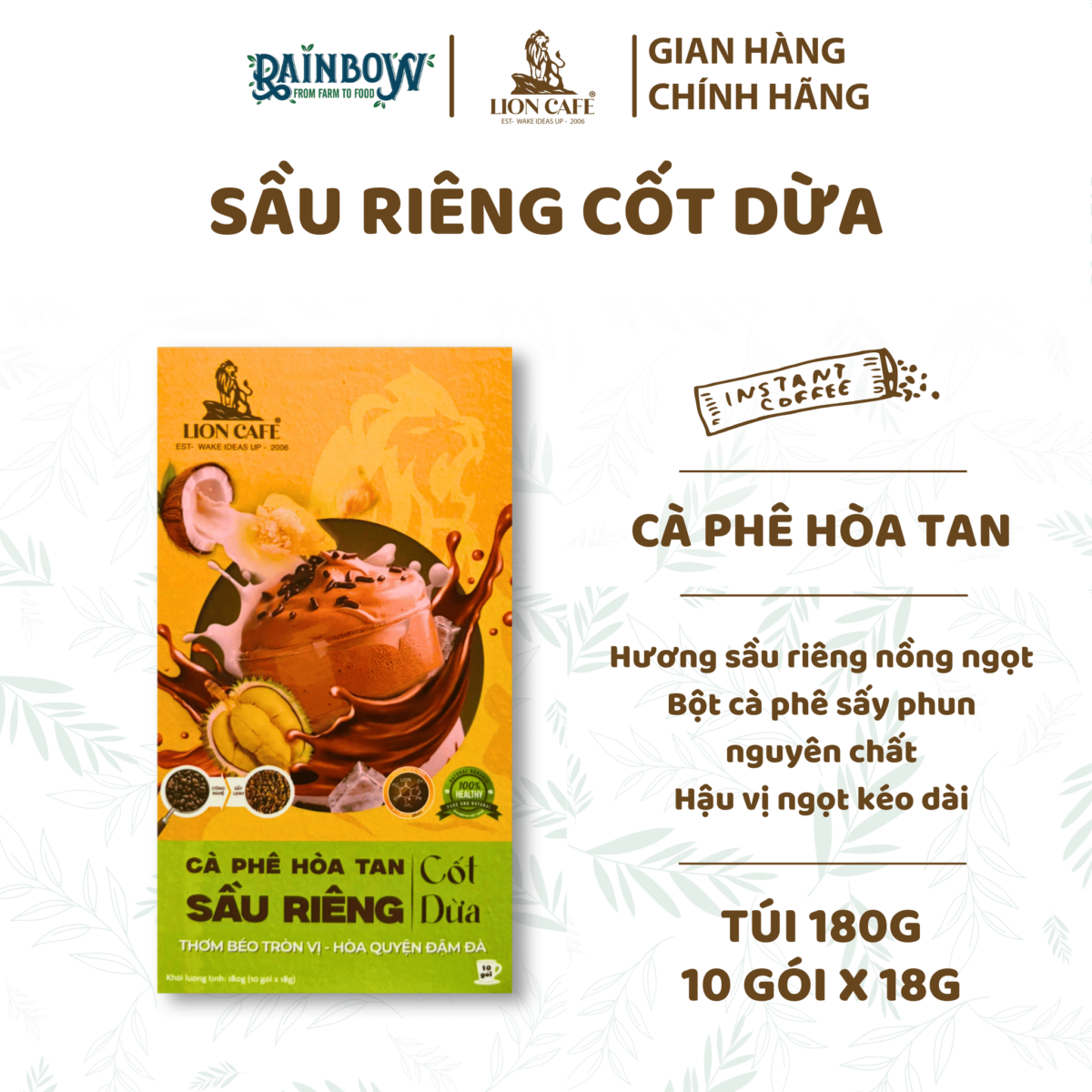 - Tên sản phẩm: LION CAFE – Cà phê hòa tan 4in1 – Sầu Riêng Cốt Dừa